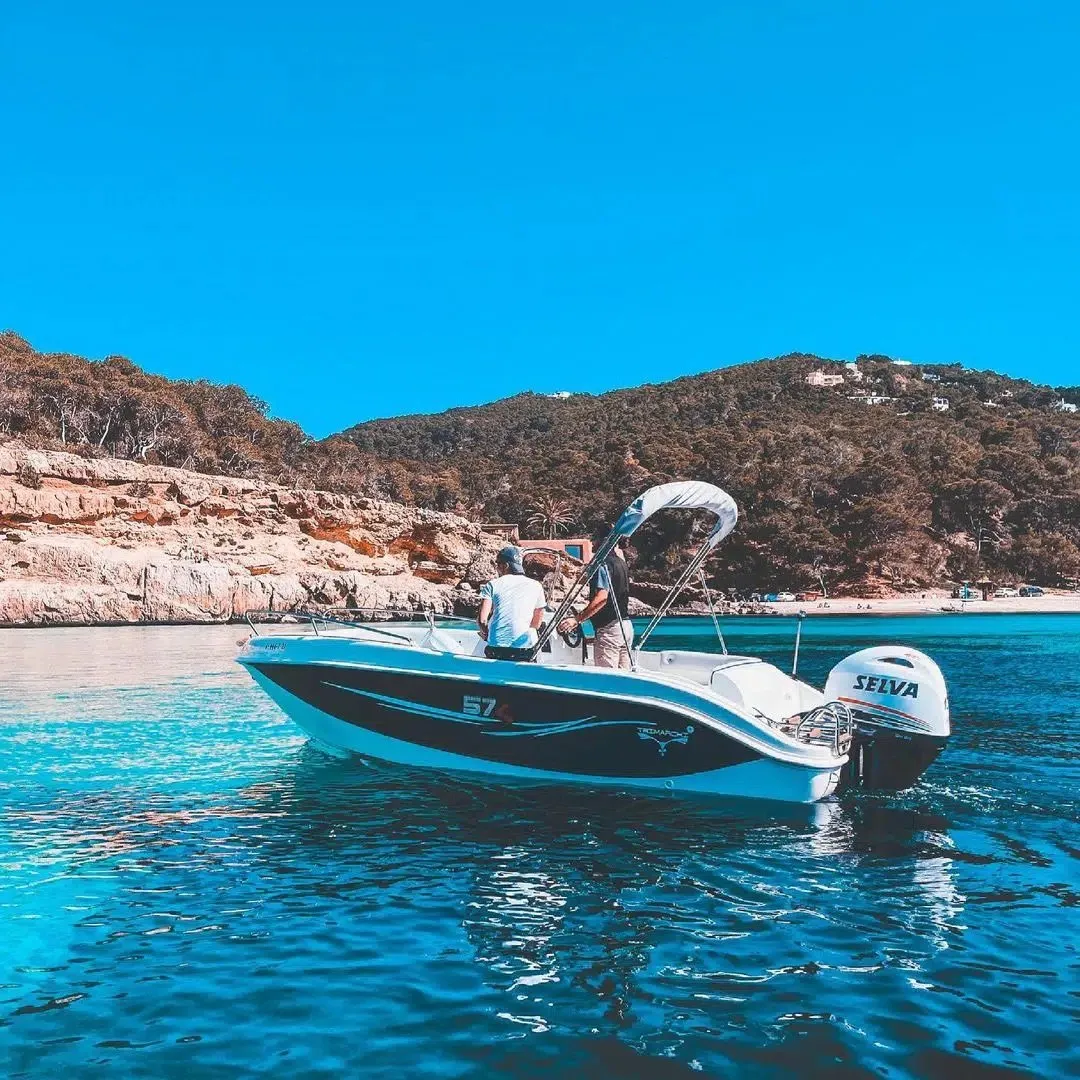 Come aboard and enjoy Full Day Blue Boat Boat Rental with your family or friends! During your boat day, you will discover one of the most beautiful coasts of Ibiza.