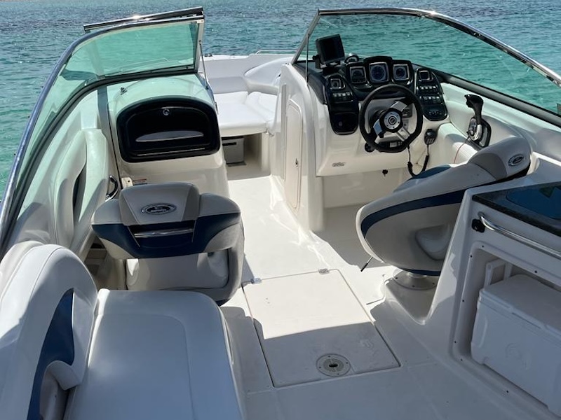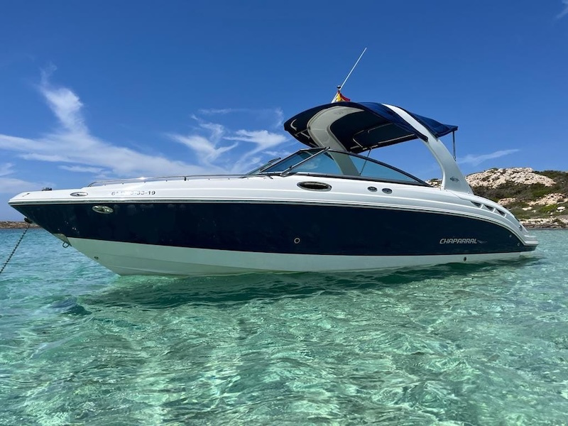 Book your full day boat charter from Ibiza to Formentera on our Chaparral 256 SSX. Up to 9 guests plus captain. Fuel included. Visit Formentera’s stunning Ses Illetes beach, explore the neighboring island of Espalmador, and enjoy a perfect day at sea. Stop along the way for some snorkeling and dive into crystal-clear waters