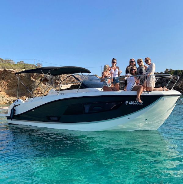 Book your half day Quicksilver boat charter in Ibiza from San Antonio for up to 11 guests plus captain. Fuel included. Explore the west coast beaches near San Antonio, including Cala Bassa and Cala Conta, or enjoy a magical sunset cruise by Café Mambo