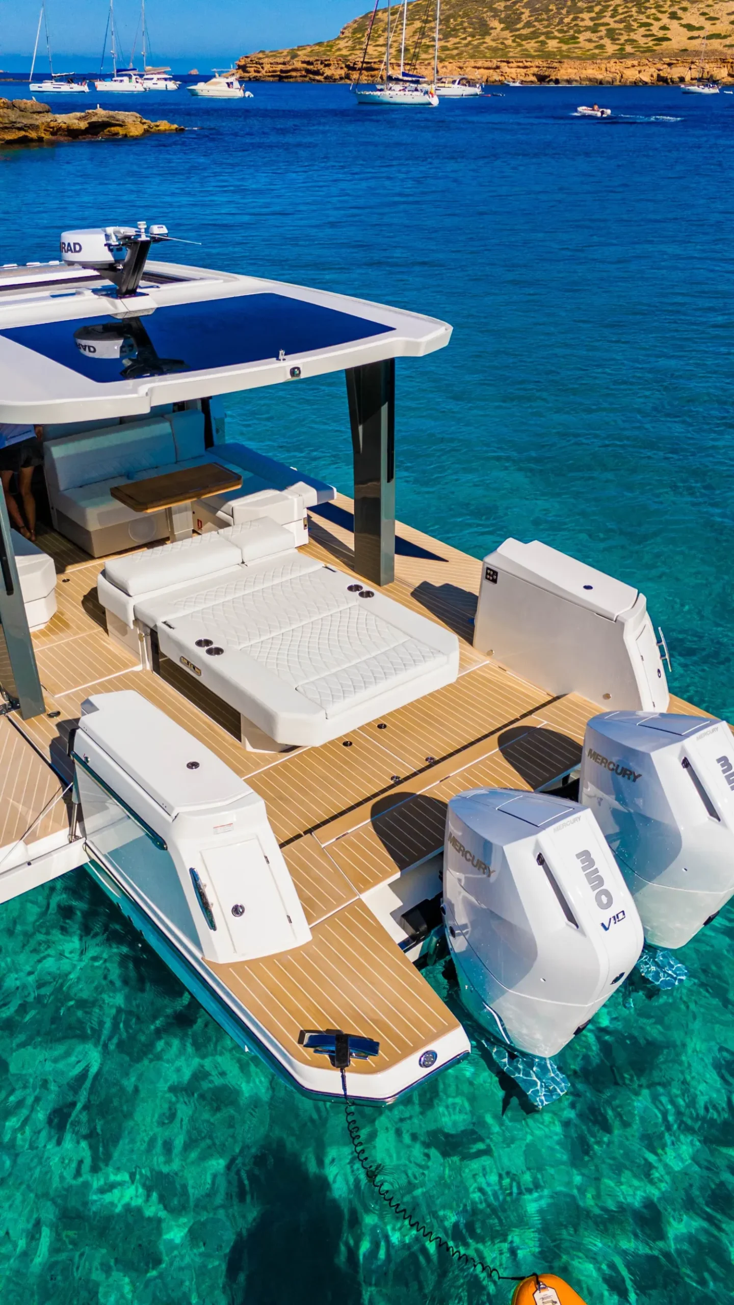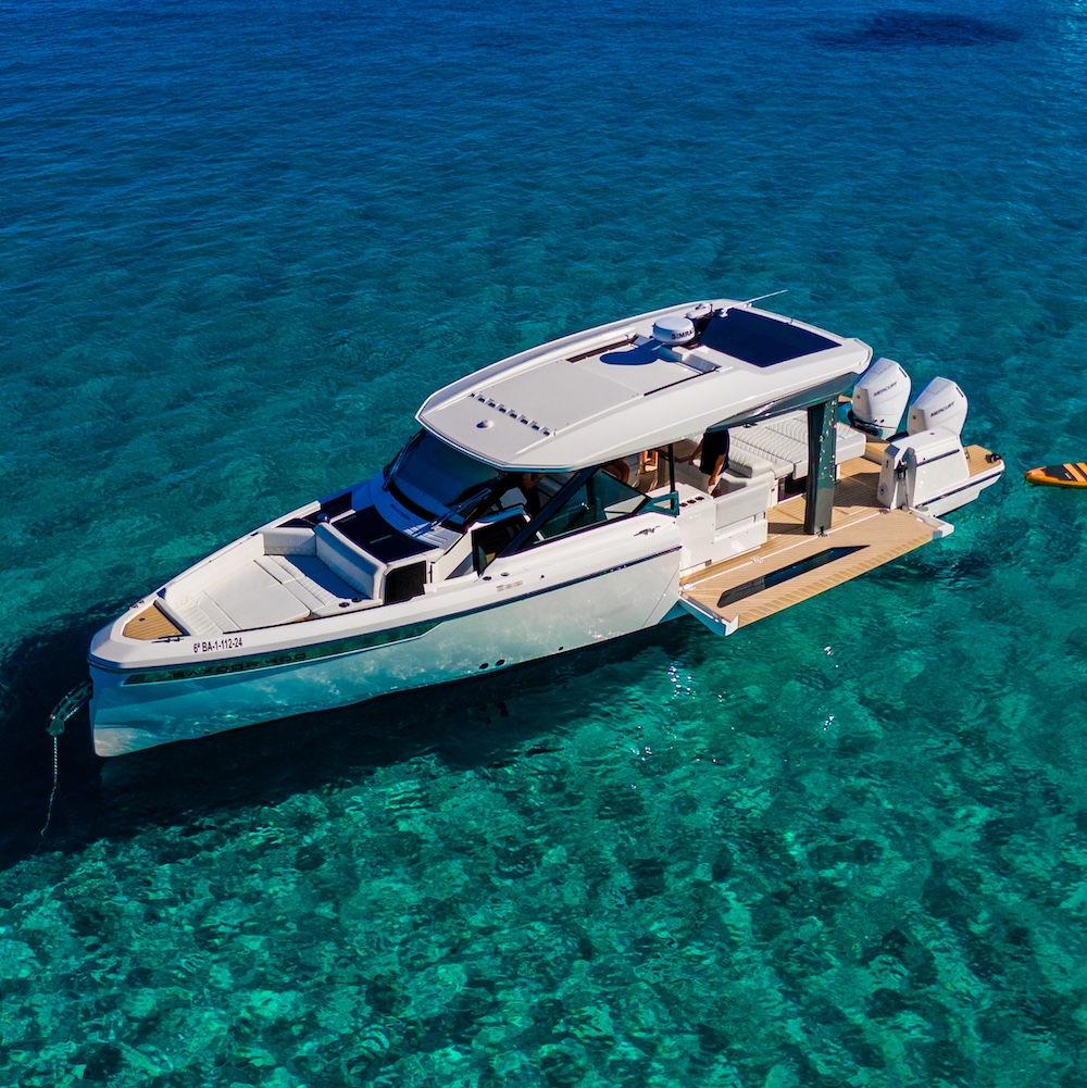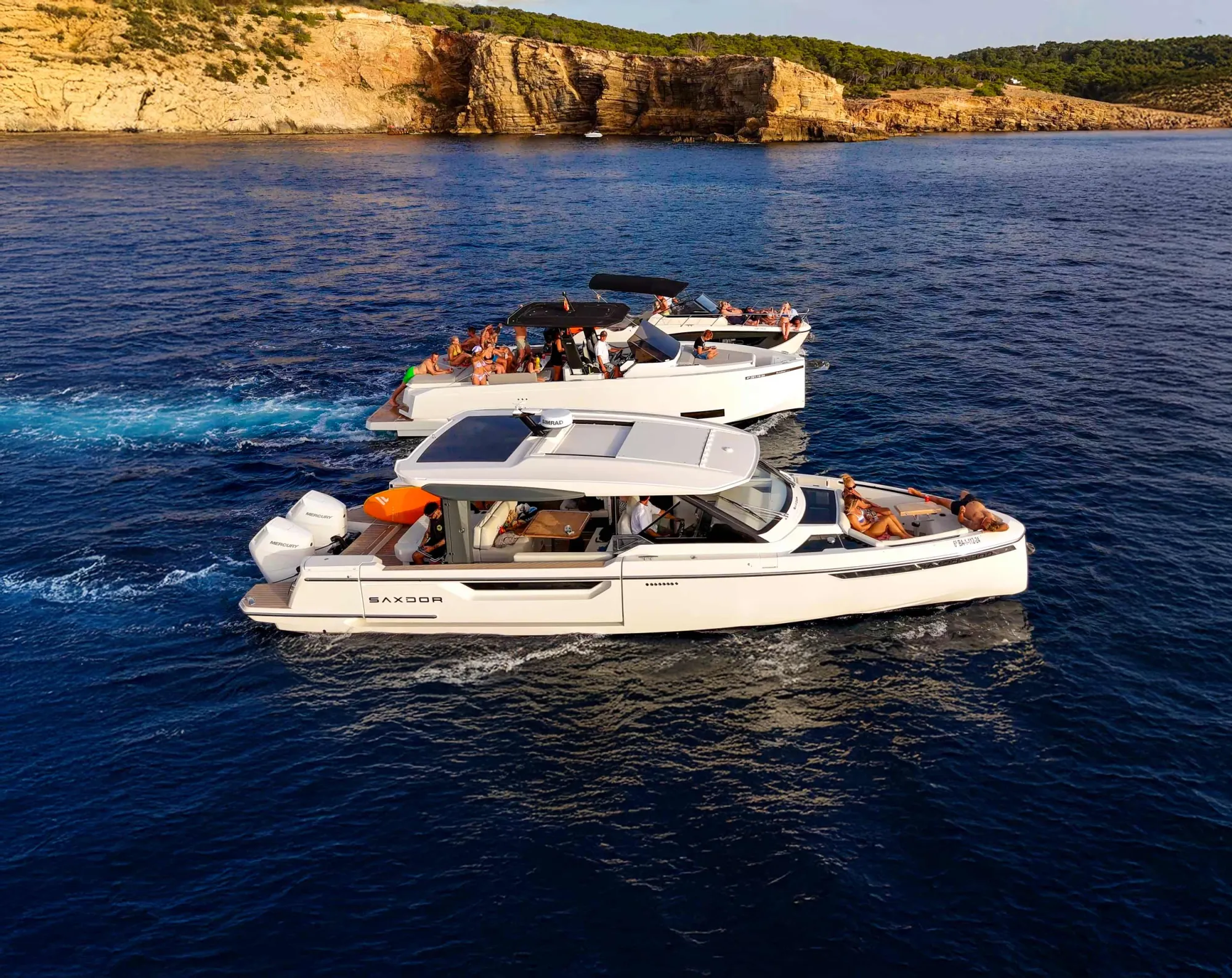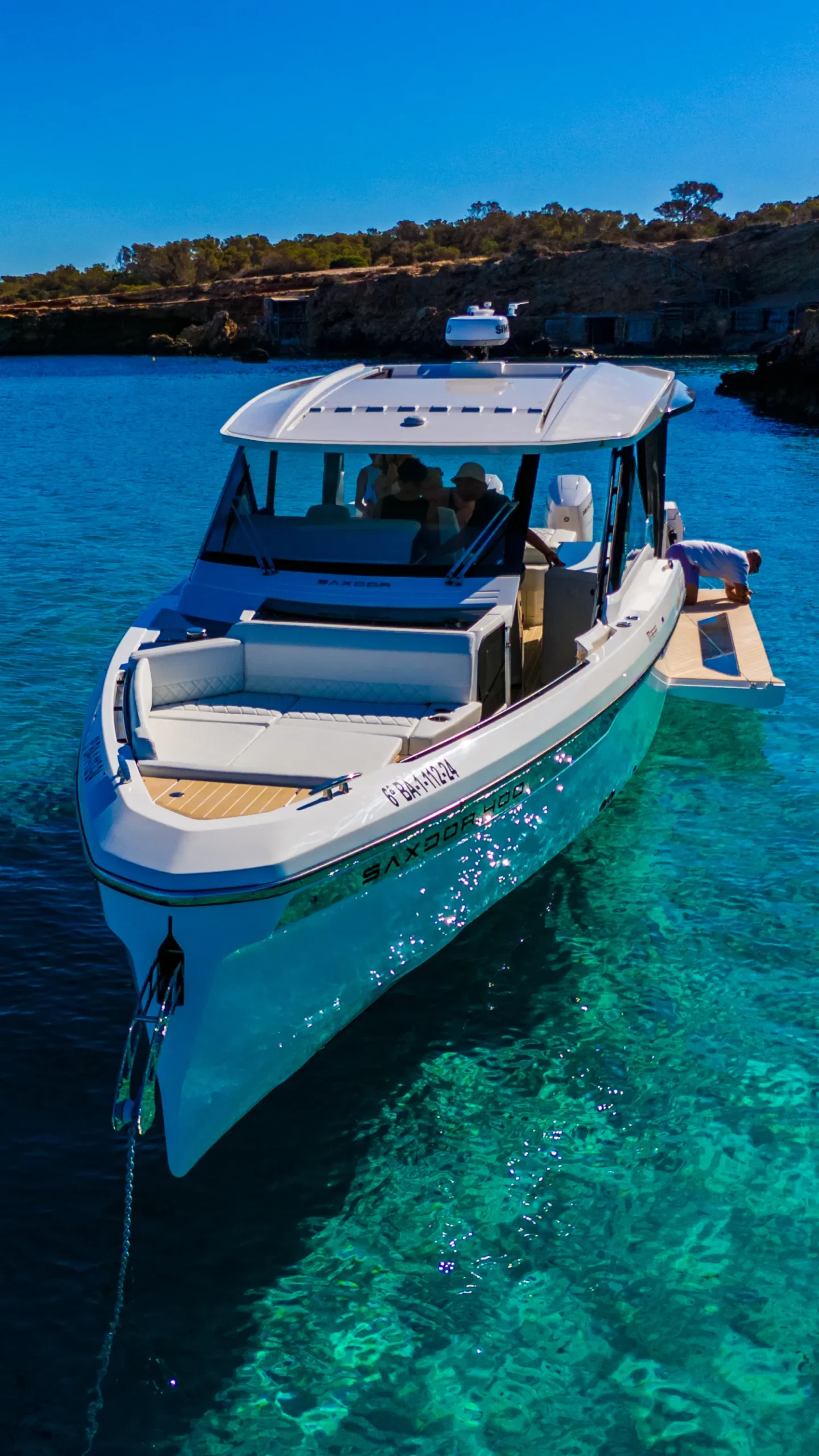 Book your full day boat charter in Ibiza from San Antonio on our luxurious Saxdor boat. Enjoy a private cruise with captain and fuel included. Discover Es Vedrà, visit Formentera, or explore Ibiza’s stunning west coast with stops at Cala Bassa and Cala Conta for an unforgettable and stylish day on the water.